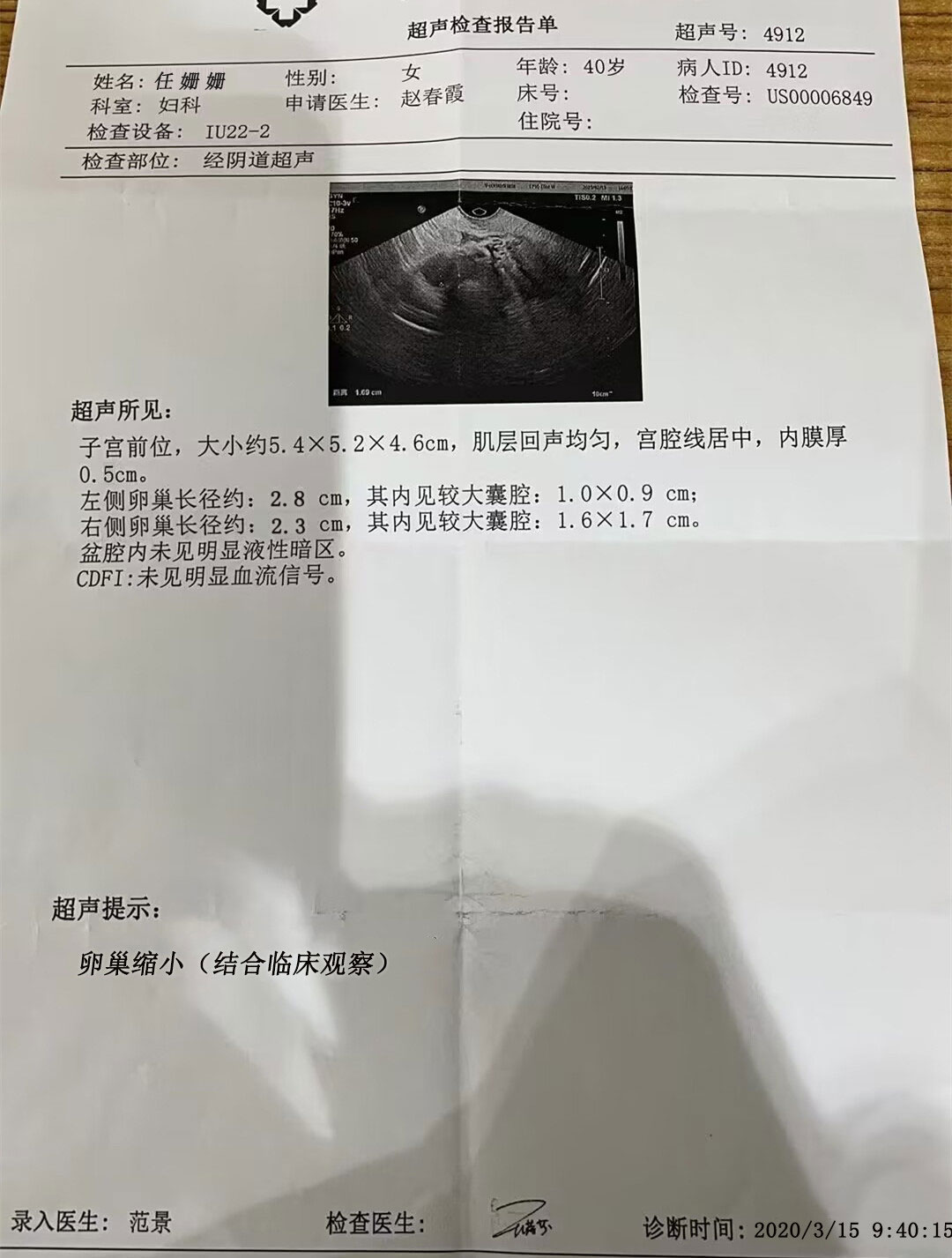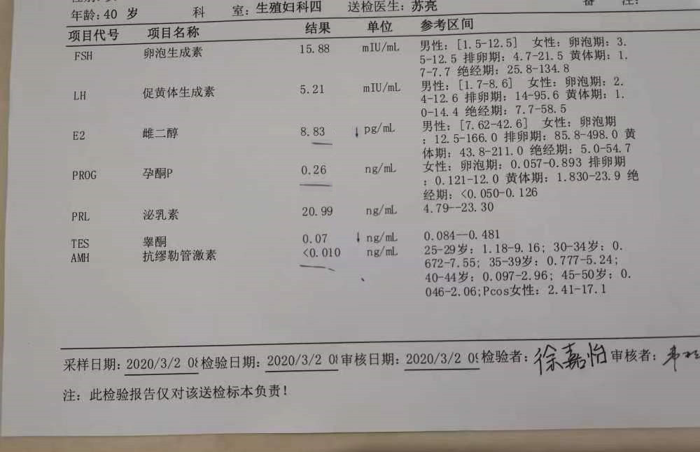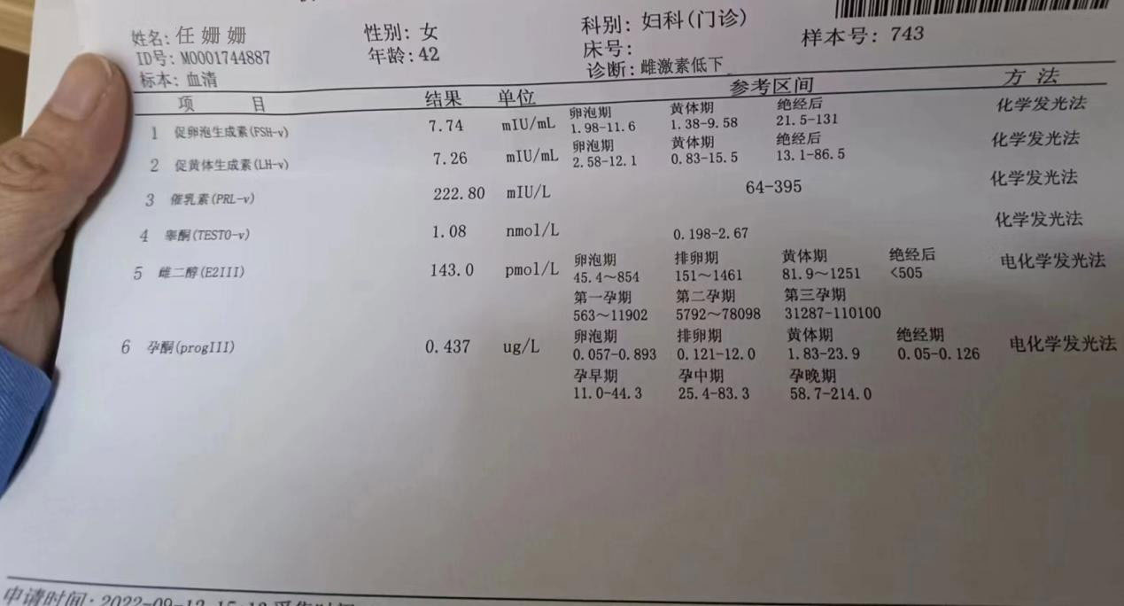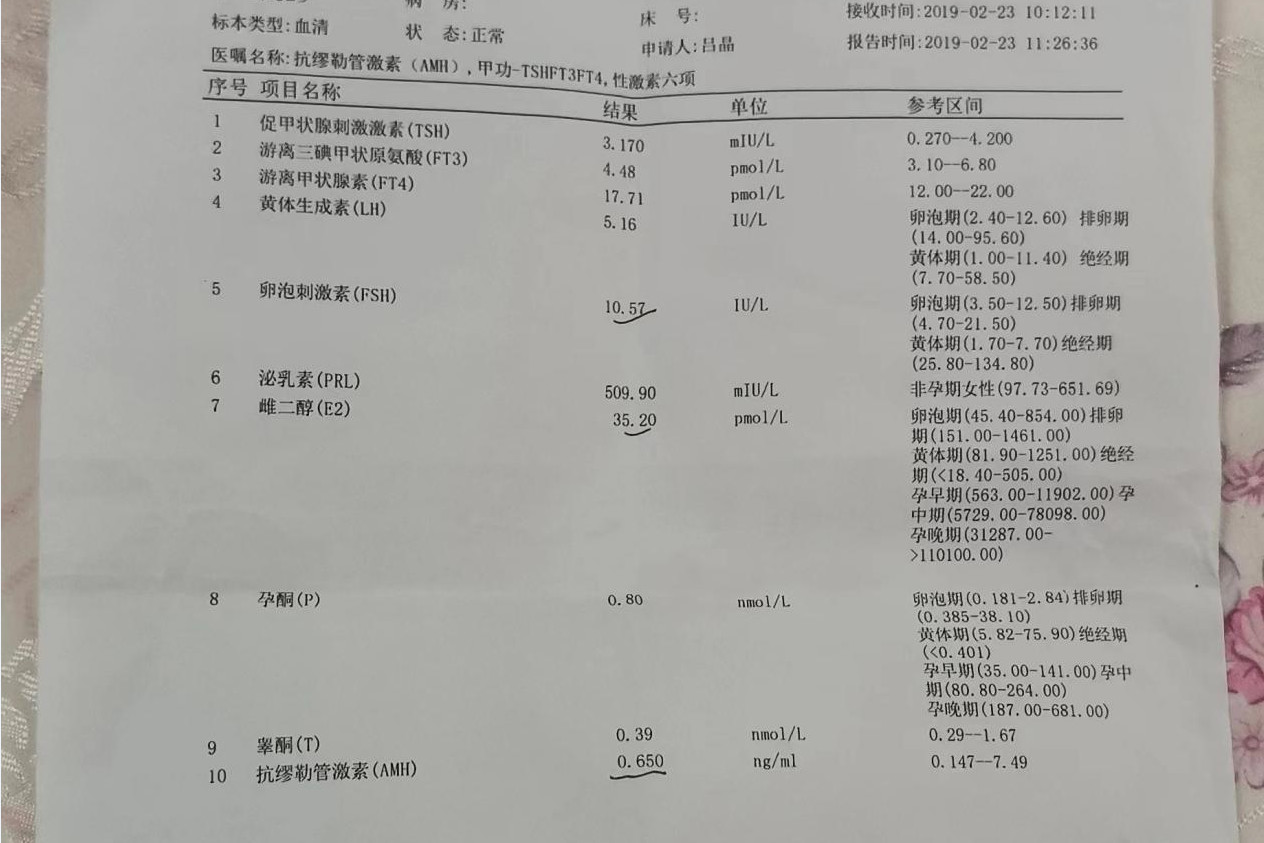 没有月经之后,整个人加速衰老,皮肤发黄开始长斑,皱纹横生,干干巴巴的;体重突然发胖,尤其是腰腹部,全是赘肉,胸部下垂;私处很干涩,同房时很不顺利;晚上失眠睡不着,白天爱出汗;情绪极不稳定,对孩子对老公,对父母也是,没有一次有耐心的时候,整天像个煤气罐,心烦气躁的,一点就着,喜怒无常。整个人的精神状态很憔悴,每天腰酸背痛病恹恹的。这个时候觉得不能干等着了,就去大医院做了详细检查,医生开了激素六项,抗缪勒试管激素,血常规,甲功,生化全套,一大堆单子。结果出来一看,雌激素孕激素低,抗缪勒试管激素很低、促卵泡激素高,卵巢缩小,子宫内膜只有0.5也很薄。